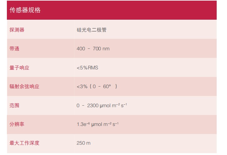 PAR傳感器用于: ● 光衰減的測量 ● 初級生產(chǎn)力研究 ● 光合作用-輻照度(P-I)曲線的制定 ● 光抑制研究 ● 水下水生植被(SAV)研究 ● 測量富營養(yǎng)區(qū) ● 研究吸收材料,全自動水質(zhì)監(jiān)測儀,例如DOM,水質(zhì)自動在線監(jiān)測儀,顏料或黃色物質(zhì) ● 光合光子通量密度(PPFD)的測量